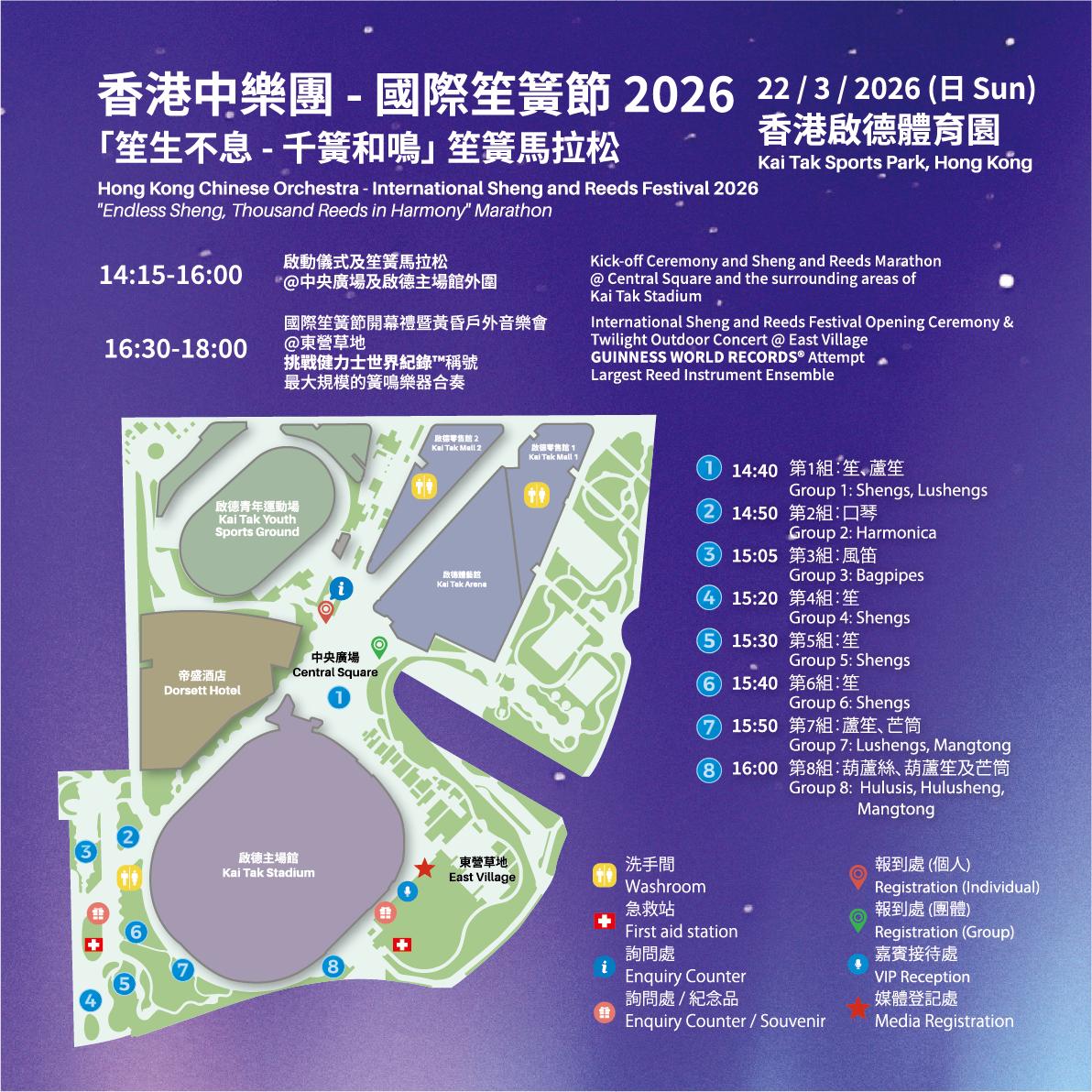| Kick-off Ceremony and Sheng and Reeds Marathon | 2:15 - 4:00 pm | Central Square and the surrounding areas of Kai Tak Stadium |
